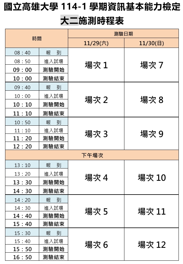 一、114-1學期【大二限定】資檢各場次時間如上表。