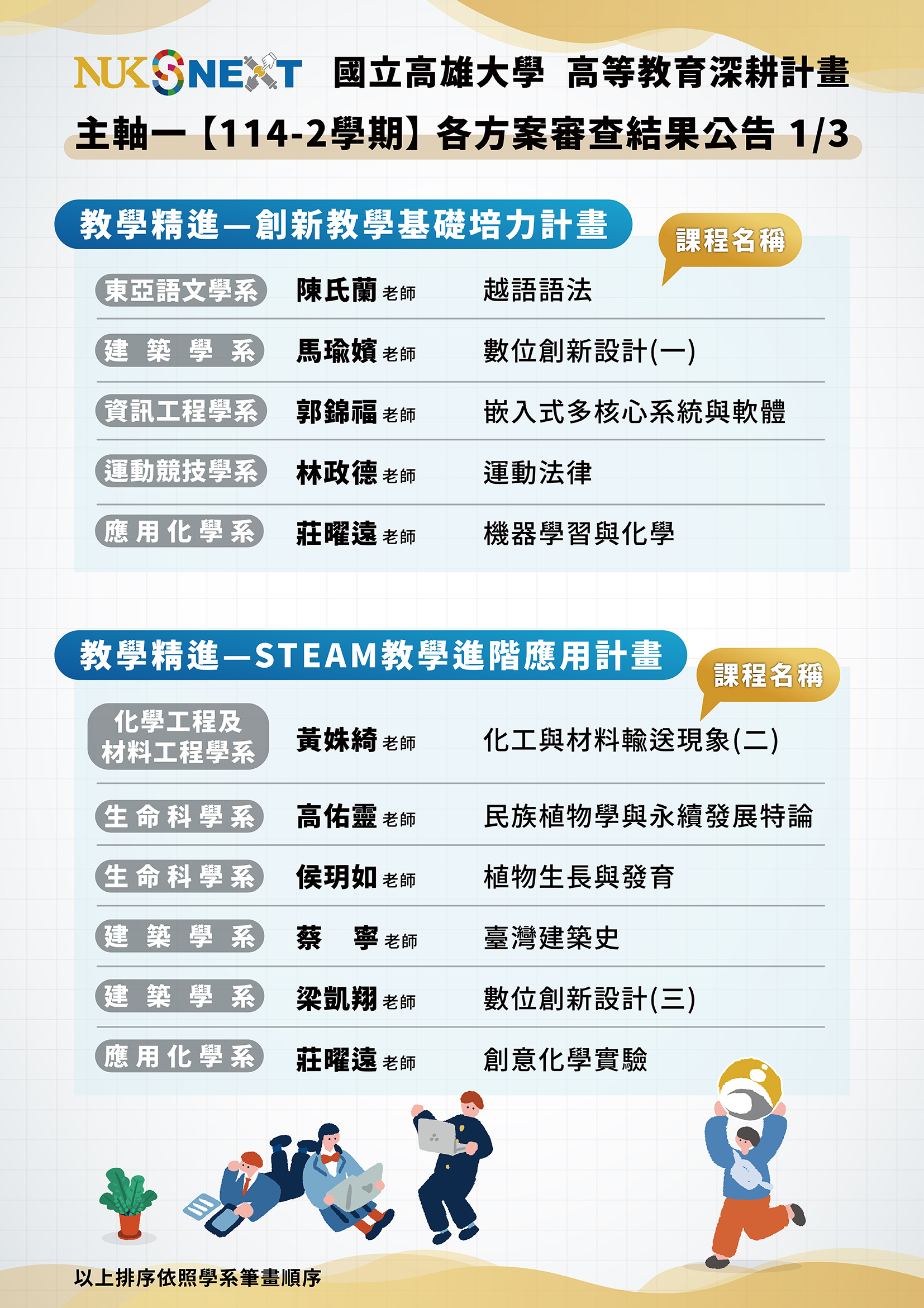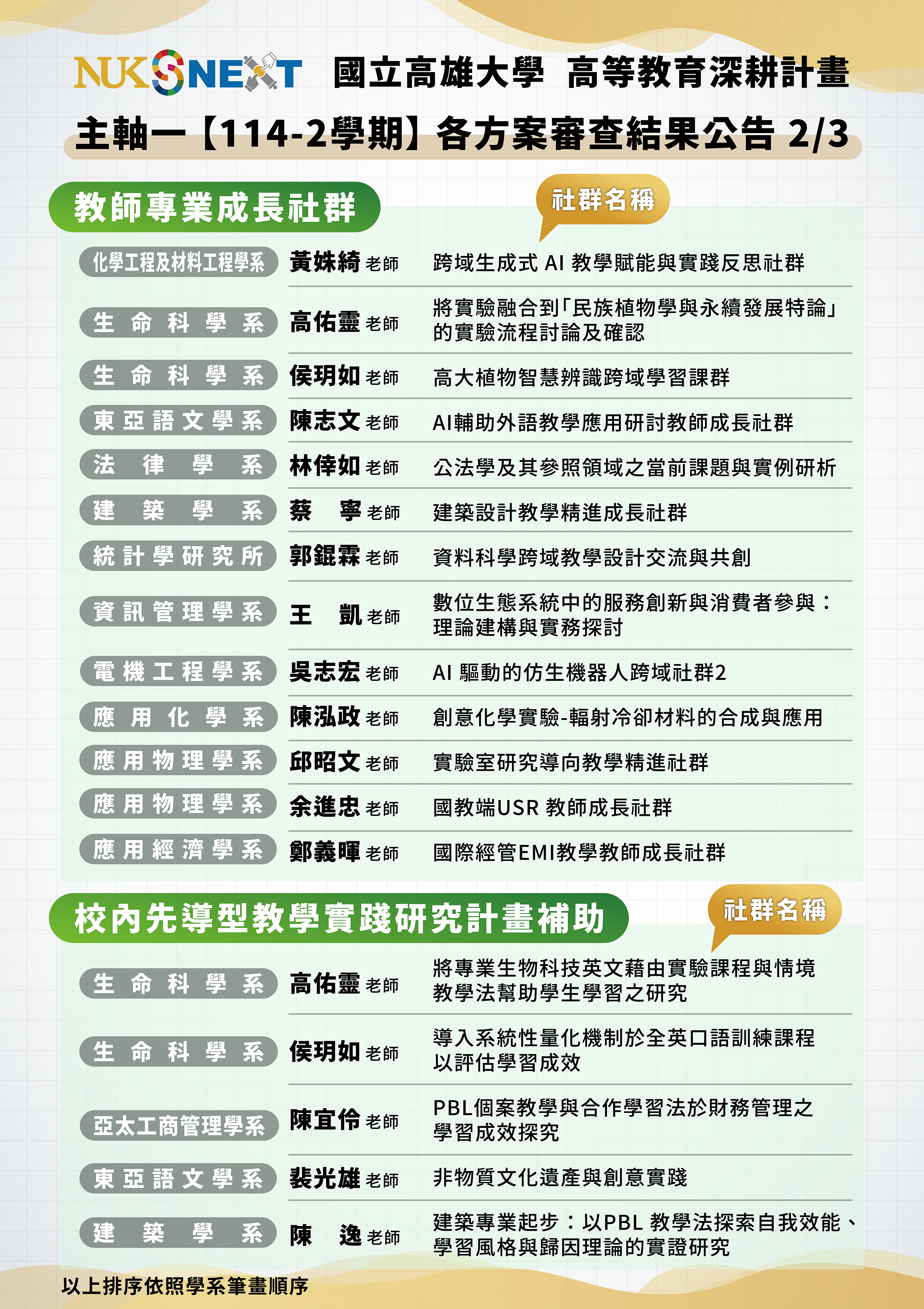 國立高雄大學高等教育深耕計畫主軸一【114-2學期】各方案審查結果公告